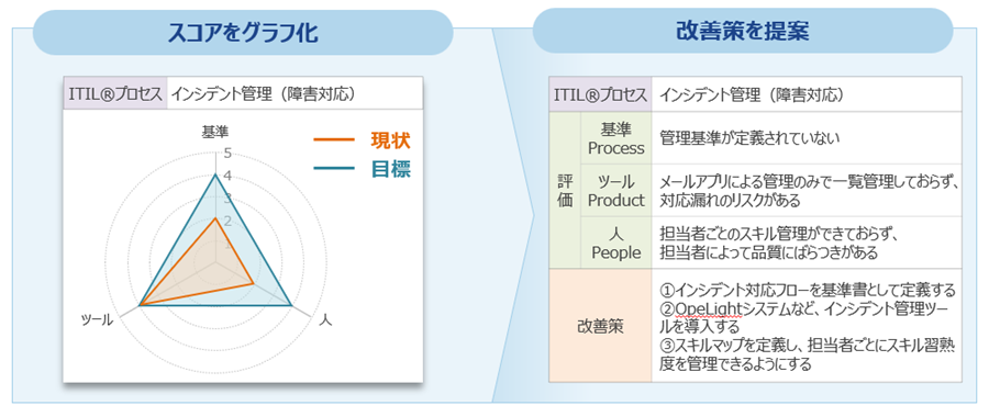 運用管理診断により、診断結果のITIL®スコアをプロセスごとにグラフ化し、適切な改善策の提案を行います。運用レベルの現状と目標の差が明確になり、お客さまに適切な改善策の提案につなげることができます。